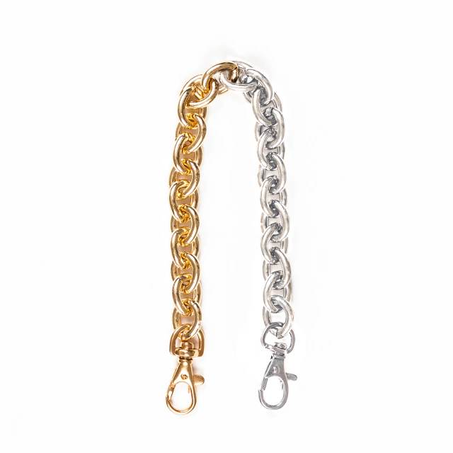Alça em corrente de alumínio montada com dois mosquetões de Zamac (liga metálica), sendo um em cada ponta da alça. Ideal para confecção de bolsas dos mais variados tipos!